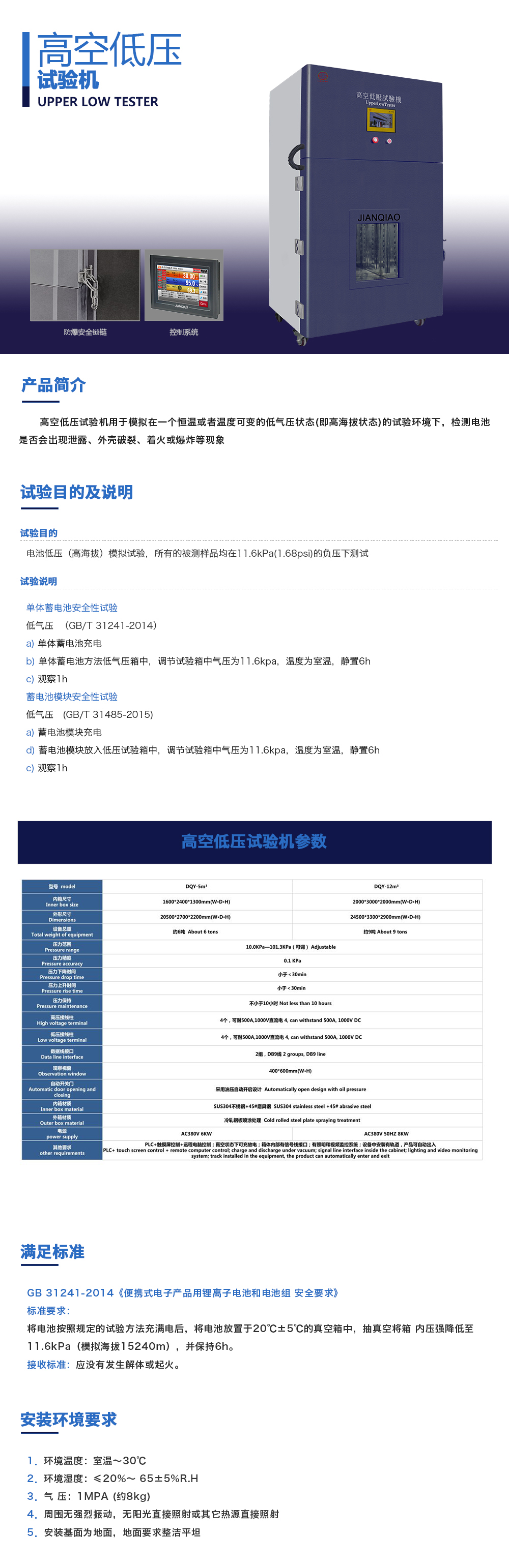 產(chǎn)品型號:JQ-8104(可定制) 品牌:劍 喬 用途:高空低壓試驗機用于模擬在一個恒溫或者溫度可變的低氣壓狀態(tài)(即高海拔狀態(tài))的試驗環(huán)境下,檢測電池是否會出現(xiàn)泄露、外殼破裂、著火或爆炸等現(xiàn)象。咨詢熱線:13829135130