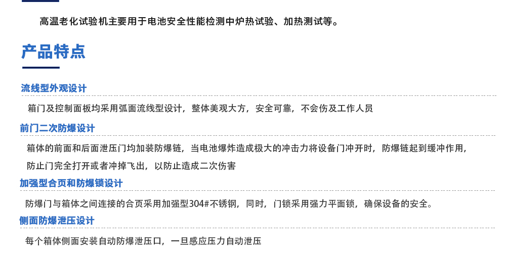 用途:高溫老化試驗機主要用于電池安全性能檢測中爐熱試驗、加熱測試等。