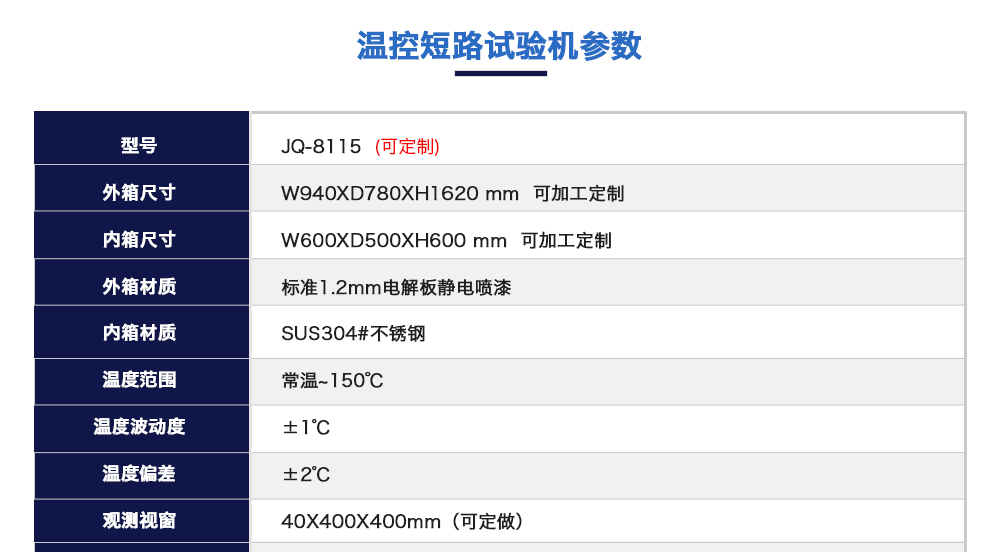 產(chǎn)品型號:JQ-8115(可定制) 品牌:劍 喬 用途:溫控型電池短路試驗機綜合多種電池短路試驗標準要求而設計按標準要求短路裝置必須符合內阻范圍≤5mΩ從而獲得試驗要求的最大短路電流咨詢熱線:13829135130