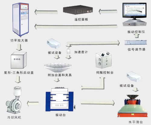 振動臺系統有幾大部分組成功率放大器(簡稱功放)控制儀、振動臺、附加臺面及夾具、制冷單元(有冷卻風機、水冷裝置)、傳感器、水平滑臺。