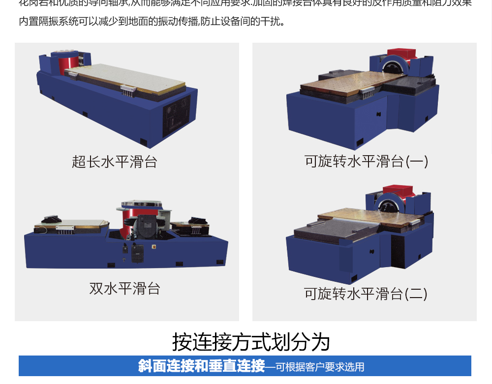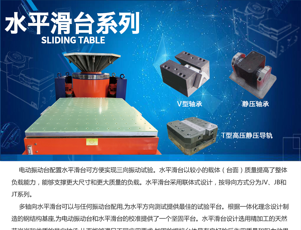 用途:振動臺配置水平滑臺可以實現(xiàn)三向振動試驗,也可以配合溫濕試驗箱形成復(fù)合環(huán)境試驗系統(tǒng)。多軸向水平滑臺可以與任何振動臺配用,為水平方向測試提供最佳的試驗平臺。根據(jù)一體化理
